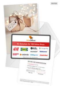 WISHCARD is the perfect gift: A gift card that can be redeemed at over 100 online shops – from A for About you to Z for Zalando. So you’re always with your gift! WISHCARD is available in the value 10, 20, 50, 100, and 200 CHF.